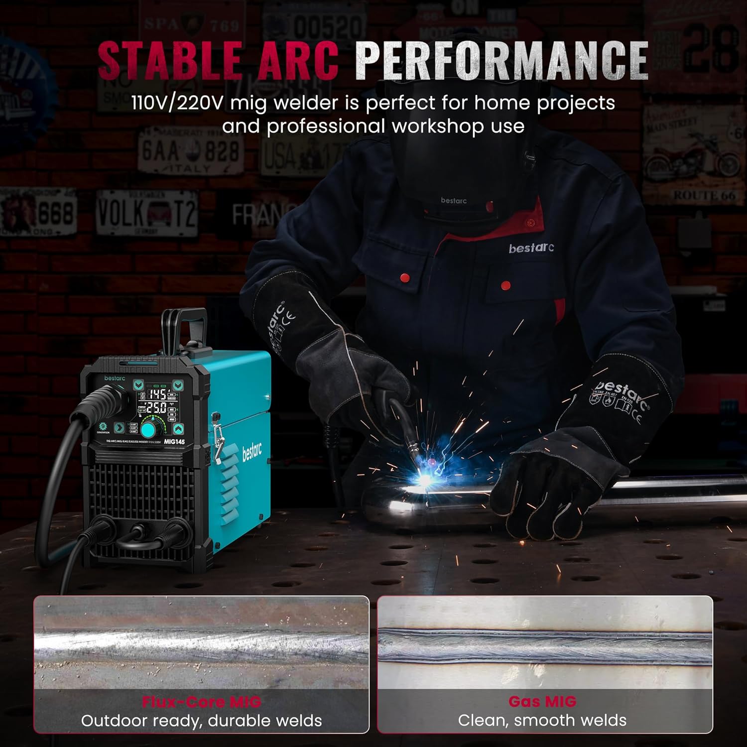 Get your own bestarc 145A MIG Welder, 110V/220V Gasless Flux Core MIG Welder/Lift TIG/Stick 3 in 1 Synergic MIG145 5GEN Welding Machine, Portable Flux Welder with Digital Screen Display today.