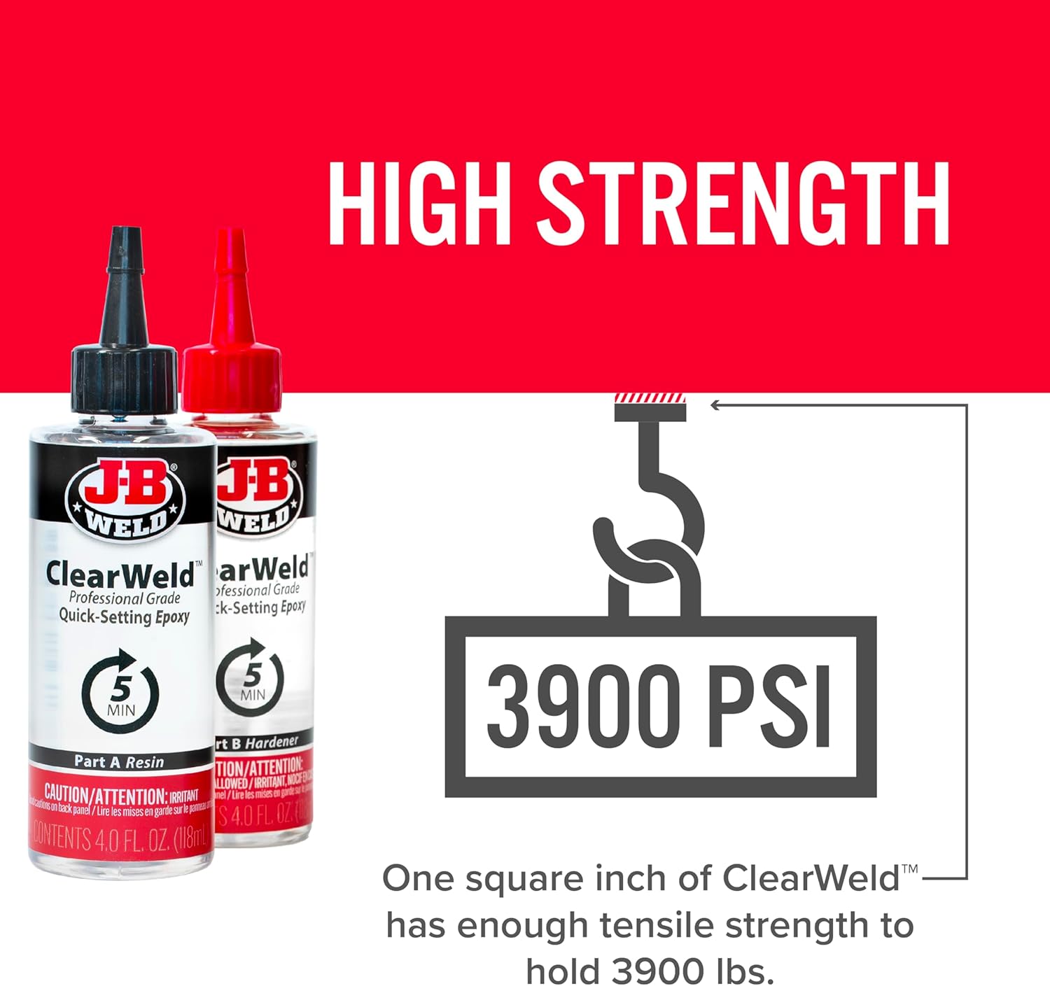 Check out the J-B Weld Pro Size ClearWeld 5 Minute Set Epoxy here.